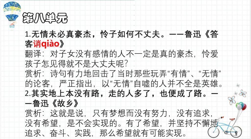 活动开始前,志愿者秉持因材施教的理念,就本次授课活动进行了分析设计并制作了具有较强针对性的PPT,以帮助同学们更好地理解所学内容。活动过程中,志愿者首先使用单元串联式讲解,通过提问的方式对之前所学的内容进行复习,同时在为每一单元配备了相应的练习题进行复习检测,以加深同学们的印象。随后对于即将学习的名人名言与成语,志愿者们通过追溯句子和成语的来源,结合初始文章所表达的情感,对句子和成语进行深度分析,并使用语境法帮助同学们理解词句的意思。最后,同学们向志愿者们询问本节课仍未理解的知识点,志愿者们耐心为其答疑解惑,同学们收获满满。至此,本次志愿服务活动圆满结束。