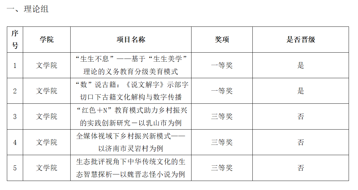 应用组《青芒学堂——大学生课堂进乡村》、《“赤魂传薪火,红志展风华”大学生红色精神宣讲》荣获二等奖。理论组《“红色+N”教育模式助力乡村振兴的实践创新研究-以乳山市为例》《全媒体视域下乡村振兴新模式——以济南市灵岩村为例》《生态批评视角下中华传统文化的生态智慧探析—以魏晋志怪小说为例》荣获三等奖。应用组《“桃李话非遗,儒冠道诗书”青少年传统文化普及》《柳梦编影—匠心柳编,助力新农人》项目荣获三等奖。