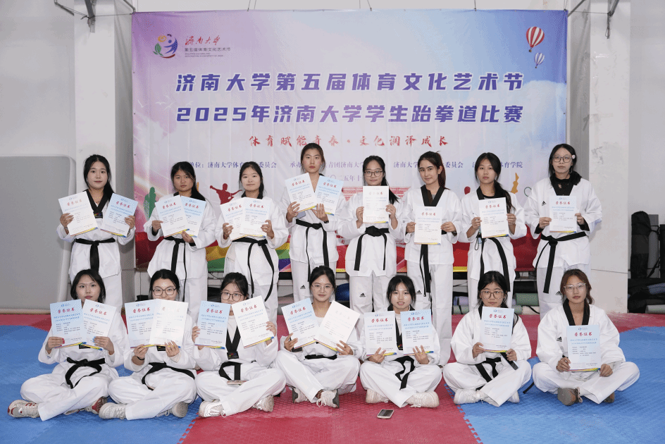 积极参赛,取得了规定团体品势及团体跆拳道舞双项二等奖和团体第四名的好成绩,其中赵婷获跆舞优秀表演奖,刘倩获最佳表演奖,范晶晶获明星队员奖、快腿一等奖,王明玉、张圆圆获规定个人品势二等奖,王明玉、葛馨宇获快腿二等奖,张圆圆、赵欣然、刘倩获快腿三等奖。