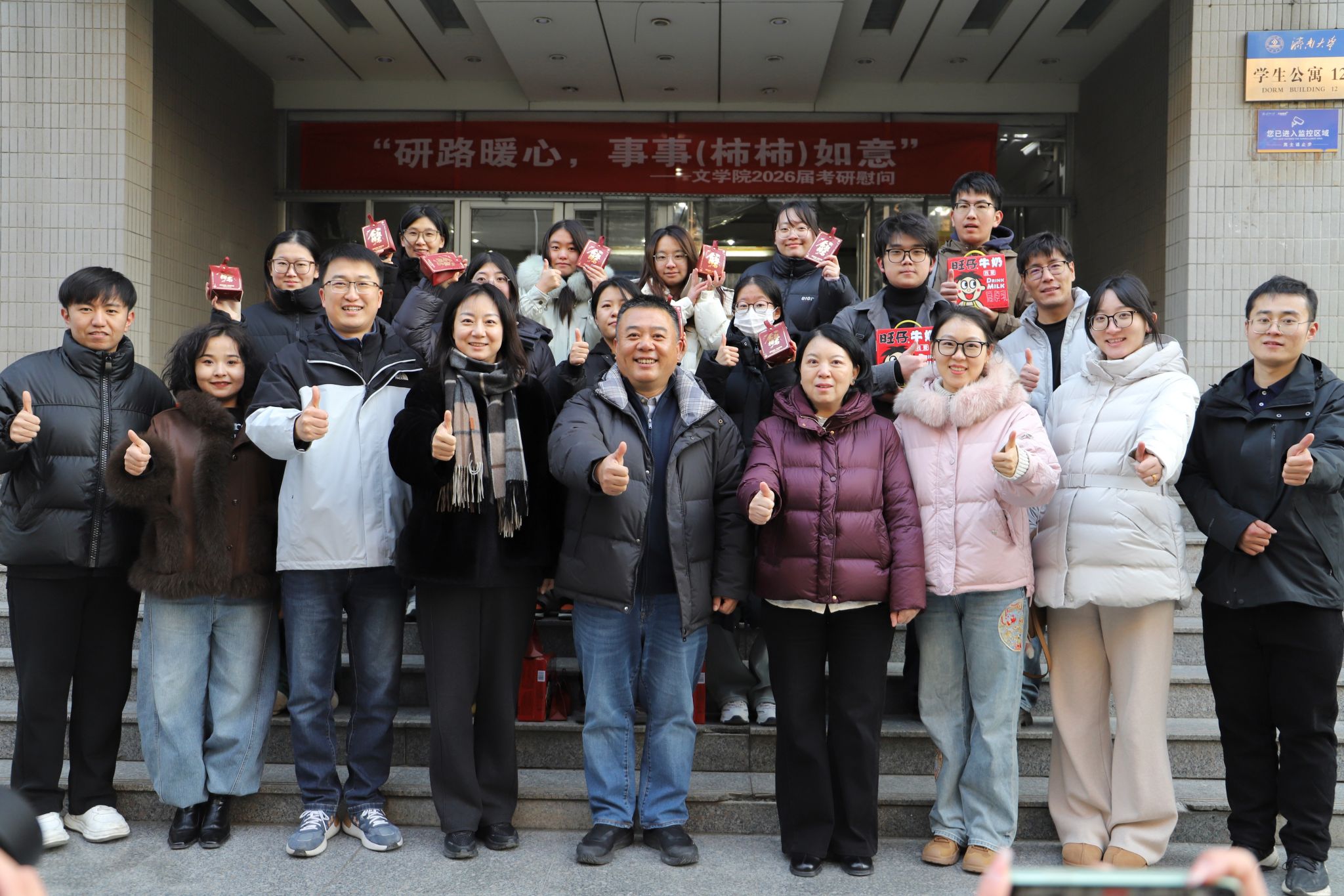 现场氛围温馨融洽,学院老师为每一位到场的同学送上精心准备的慰问品:每宿舍一箱“旺仔牛奶”,寓意“才气旺旺、好运连连”;个人专属小礼盒中,精美书签寄托“书写未来,落笔有神”的祝愿,“柿柿如意”钥匙扣则承载“事事顺心、如愿以偿”的美好寓意,每一份礼盒打包、每一箱牛奶搬运都凝聚着学院师生对2022级考研学子们的深情厚谊。礼物虽轻,情谊深重,同学们纷纷表达感谢之情。考研学生如是说:“学院的关怀让我们倍感温暖,也更有力量迎接最后的挑战。我们定不负期待,奋力一搏!”