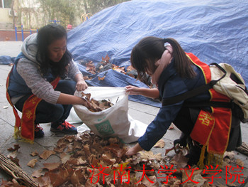 11月16日下午2:30,志愿者们于升华广场集合后在活动负责人的带领下来到老年公寓。进入公寓后,活动负责人简单讲述了注意事项,志愿者们便开始工作了。屋内,志愿者们嘘寒问暖,与老人拉家常,告诉他们注意身体;屋外,大家正热火朝天地与落叶“战斗”,大风为打扫落叶的工作带来诸多不便,要么是把刚扫作一团的树叶堆吹散,要不就是将树上的枯叶又一次吹落在刚刚打扫完的院子里。志愿者们两个一组,三个一行,或扫地或用手往口袋装树叶,手上衣服上裤子上都沾满了灰。“虽然很累,但是我们都很高兴,能够为老人们打扫院子,在这个冬天为他们送去温暖,累点儿还是挺值得的。”一位志愿者微笑着说。