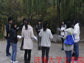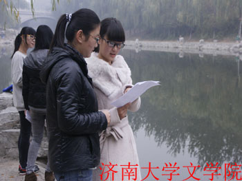 清晨的甲子湖畔,烟雾缭绕,空气清冷,但依然阻挡不了新成员的练习热情。他们早早来到训练场地,沿甲子湖畔依次排开,拿出早就准备好的朗诵材料,面对悠悠湖水放声诵读,声音此起彼伏,嘹亮清脆。首先进行的是复习打开口腔训练,成员们认真地复习着动作要领,为接下来的训练做准备。然后,成员们围在一起进行“数枣歌”和绕口令的练习来练气和提高舌头灵活度。接下来,正式进行改善音色练习,副会长亲自示范和讲解,成员们听得认真仔细,并跃跃欲试。一段时间的自由练习后,会长和副会长依次指出大家的问题并纠正。最后,晨朗训练接近尾声,会长向成员们布置了下一次的任务——“四字歌”、普通话、绕口令的练习以及加快嘴唇的训练。