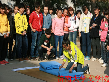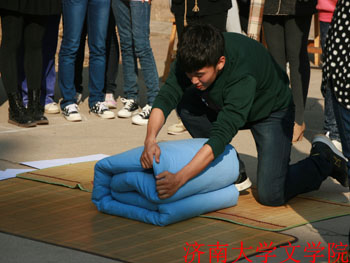 首先由主持人介绍规则及注意事项,第一轮为小组淘汰赛,所有选手通过现场抽签被分为八个小组,每个小组有三名选手。计时人员一声令下,比赛正式开始。在有限的一分钟时间内,选手们熟练铺平被子,细致地分割比例,动作有条不紊,争分夺秒地规整着被子。一名男选手凭借纯熟的技术、规范的动作和惊人的速度,赢得在场观众的掌声。小组赛结束,共有表现出色的12名同学成功进入决赛,按照第一轮的比赛成绩,分数较低者先进行比赛,限时一分钟。在紧张的决赛中,选手们保持高昂的斗志和万分集中的精神,尽全力叠出最令自己满意的被子。最后,学17—201脱颖而出,荣获一等奖。