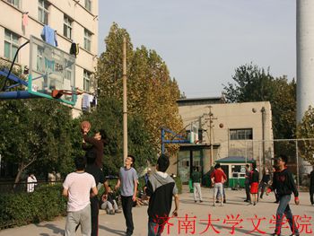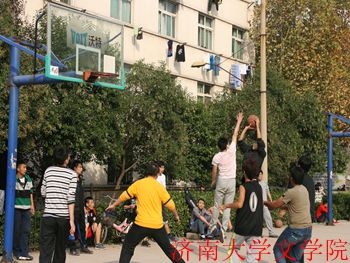 2013级新生篮球赛友谊赛在三食篮球场举行,友谊赛对阵双方为2013届新生、大二、大三混队(黑队)和大三、大四混队(红队)。