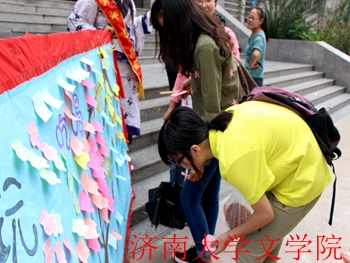 志愿者于学12楼下开展“玩遍泉城”活动。
