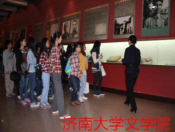 入党积极分子一行首先在毛泽东题字的革命烈士纪念塔前合影拍照,随后便在负责人的组织下有序地进入济南战役纪念馆。馆内,在解说员的带领了,同学们欣赏了描述战争经过的图片,瞻仰了真实的革命烈士在战争中使用过的各种生活用品、各式各样在战争中起过重大作用的武器、以及民众支援前线的工具,了解了济南战役的全过程,他们深刻地感受到了革命先烈作战条件的艰苦以及军民同心的力量。随后同学们进入全景画馆,通过三维动画模拟场景,生动再现了当年战争恢弘磅礴、紧张激烈的局面以及人民解放军同敌人顽强搏斗的场面。同学们在感慨场面的生动壮观之时,也被先辈们为祖国的解放而奋勇直前不惧牺牲的伟大精神折服。