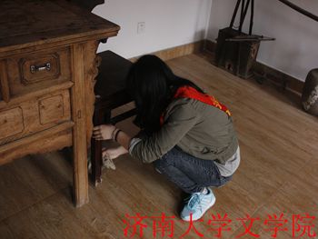 志愿者打扫陈列馆中的四个展馆。扫地,擦桌椅,拖地,志愿者们明确分工,通力合作,仔细清理每个角落,极其负责地完成这个意外的活动。在采访中,对于意外增加的活动,志愿者说道:“这是个不对外开放的展馆,虽然不在活动计划内,但我们一边打扫,一边欣赏山东民俗文化,我们享受这个过程。”
