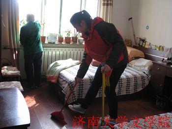 下午2点30分,志愿者们一到达老年公寓,工作人员便热情地把大家迎到屋里,随后,她简单安排了志愿者们各自服务的楼层,交待了需要干的工作,包括扫地、打热水、擦拭家具和帮工作人员收拾晾晒的衣物等。活动中,两位志愿者还陪着一位八十几岁的老奶奶聊天。老奶奶见到我们特别开心,自然而然说的话也多了。老奶奶说,她年轻时是一名党员干部,还教过小学生。说话之余,老奶奶还高兴地为我们唱了两句《没有共产党就没有新中国》。老奶奶对志愿者说,她很感谢志愿者们为老人做的这些事,看到志愿者们就像看到自己的孩子一样。为了不打扰老奶奶休息,志愿者们提出要离开,老奶奶拄着拐杖站起来非要把志愿者送到门口,希望志愿者们能经常去看看他们这些老人。
