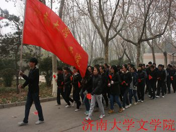 代表队第一个开跑,虽然略有雾霾,且气温较低,同学们还是斗志昂扬,迈着坚定的步伐沿着指定路线前进,大家相互鼓励前进并保持着队列的整齐,“红一二九,精神抖擞,放马金鞍,唯我文院!”,响亮的口号声回荡在济大上空。 此次长跑路线共设有9个监督点,每个地点都有相应的工作人员综合各个方面为每