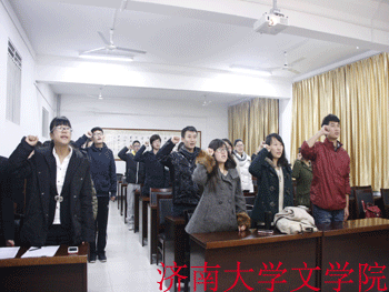 接下来是宣誓仪式,全体起立,伴随着主持人的宣读,各位团干宣誓道:我志愿成为优秀团干,坚决拥护中国共产党的领导,遵守团的章程,执行团的决议,履行团干义务,严守团的纪律,勤奋学习,积极工作,吃苦在前,享受在后,为共产主义事业而奋斗。