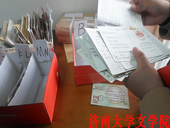 此次活动负责人就与收发室负责老师取得联系,确认好了活动相关细节。志愿者们事先制作了4个纸盒,为了使明信片排放得一目了然,他们将每个纸盒分为三格,以姓氏首字母划分区域,将写有字母的卡纸粘贴在每部分的纸盒内侧。共有4名志愿者参加了此次活动,每人负责一个纸盒,四人交流协调、默契配合,以确保明信片准确无误地放到相应位置。整理过程中,有些卡纸未粘好掉了下来,志愿者们及时进行固定;盒子中间的隔板被压在明信片中,志愿者们便利用收发室原有的盒子,将首字母卡重新粘贴在旧盒子上。屋外寒风阵阵,屋内却一片其乐融融。在志愿者的努力下,明信片被按类规整好,此次活动就此结束。