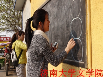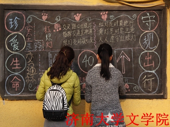 下午4:00,志愿者到达王官庄小区办事处,与负责人协商后开始了出板报的工作。志愿者在擦干净的黑板上设计出板报的大纲,规划好板块,然后开始填充与交通安全的宣传内容,其中既有出行交通的小常识,也有交通标志的介绍。细心的志愿者更将常见的交通标志画在了板报上,以示人们规范出行。为美化外观,他们还精心设计了花纹为板报润色。整个过程持续了近一个小时,志愿者搜集资料,并自己规划板块,中途还引来不少居民观看,更有一位老爷爷热心地为志愿者提出了一些建议。下午4:50,板报活动成功结束。