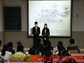 此次活动的参赛者多为14级新生,经过了一轮激烈的初赛选拔,最终进入决赛的共有13位选手。比赛开始之前他们就在场下摩拳擦掌,紧密筹备,看上去都很有自信。比赛共分为三个环节:古诗填词、提示背诵和古诗词朗诵。其中在古诗填词和古诗词朗诵中,选手们基本都做到了对答如流和声情并茂。但对于有的诗句,如:“景翳翳以将入,抚孤松而盘桓。”“三顾频烦天下计,两朝开济老臣心”……这样经典的诗句,选手们却有的记着下句忘上句,等到下台后才猛然记起,以至于懊悔不已。这真应了那句诗“不识庐山真面目,只缘身在此山中”。这也显示了选手对于有的诗句缺乏一种深刻的理解,一些经典优美的诗词在记忆里变得模糊,实在应该引起大家的警觉。