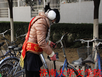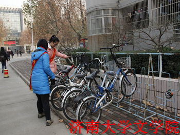 济南冬天的风吹得很冷,但志愿者们依然在15:30的时候整齐地站在了学12大厅里。在路上,有位志愿者问我们两个记者冷不冷,和他们同样站在寒风中,又看见身后的笑脸,我们也笑着说不冷。他们动作很麻利,虽然人数不太多,但相互之间似乎都有默契,不一会儿,那一排排的自行车由凌乱变得整齐了,果然集体是力量的源泉,众人是智慧的摇篮。