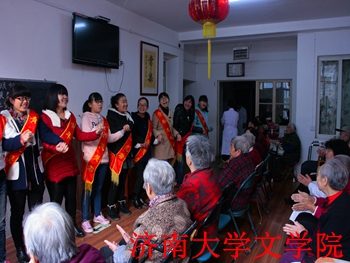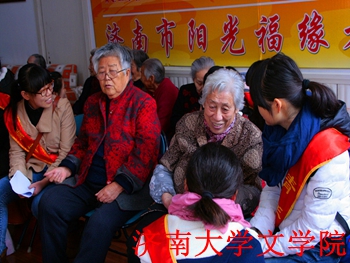 校歌和喜闻乐见的健康操,带动了现场气氛,让老年人感受到了志愿者的热情与爱心。表演结束后,志愿们来到老年人的身旁,老人们向志愿者讲述自己的青春以及过去的趣事。此次活动中,不只志愿者表演了节目,老年公寓的负责人们也为大家展示了《南泥湾》等表演。