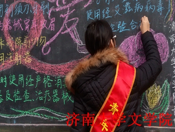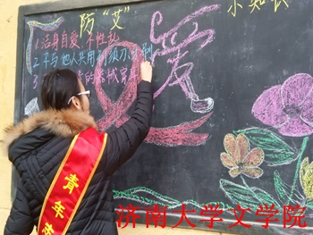 青年志愿者在王官庄小区举办防“艾” 小知识的黑板报活动。