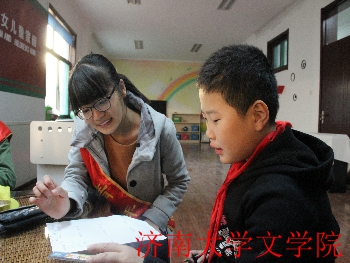 志愿者们来到王官庄小区服务站,与社区负责人进行说明与协调后,在工作人员的带领下进入学习教室。没过多久,就有放了学的小学生来到教室,志愿者们与他们亲切地打招呼,了解他们的基本学习情况。在熟悉了对方之后,志愿者们开始了作业辅导。一位小男孩拿出了自己的数学作业,埋头计算,志愿者们轻声提醒他,为他矫正坐姿。当他遇到难点时,志愿者们十分热心地为他解答,并且逐步引导小男孩思考解题思路,循循善诱。