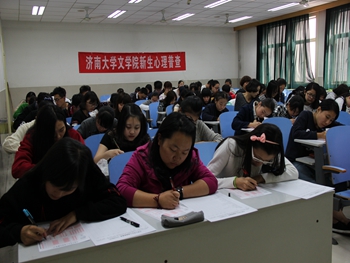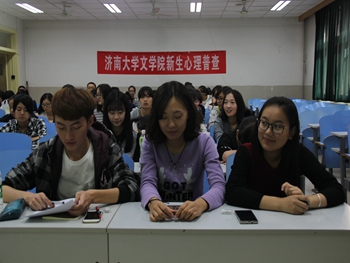学生联合会心理发展部成员宣读《2015年新生心理普查导读》,以加强同学们对心理普查施行方法和注意事项的理解。宣读完毕后发放问卷开始测试。测试过程中,同学们都严肃认真,对待试题一丝不苟,按照真实情况有序填写,最终圆满完成了测试。