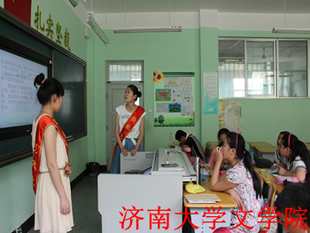 志愿者们在课堂开始的前几分钟就为他们播放了一段优美的音乐,提起他们的兴趣。不同年级的学生端坐在教室内,认真的听志愿者们讲课。在讲《山海经》的教室内,志愿者们先对他们进行了提问,孩子们也对“炎帝的女儿精卫的真名叫什么?”“金乌住在哪里?”等问题,进行了抢答,志愿者对他们的准确回答进行了肯定。在讲《战国策》的教室中,志愿者们向他们讲述了“狡兔三窟”“高枕无忧”等成语的来历与含义,孩子们也在课堂上踊跃的提问与讨论。在讲完两个专题的内容后,志愿者们又给他们播放了《最强大脑》、《一站到底》等益智节目,充分增加课堂的趣味性。