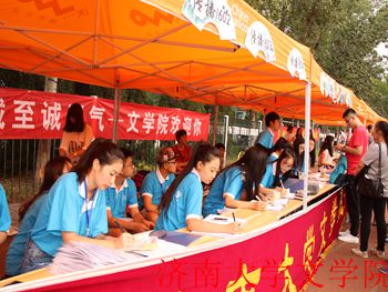 关爱新生党员服务站”,为新生提供指导和给因搬运行李而劳累的新生和家长送水。