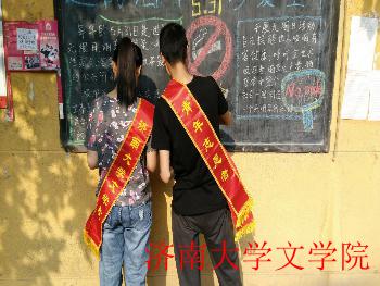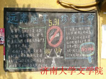 经过一个半小时的努力,一期精美的板报终于绘制完成了。板报中央是一个醒目的禁止吸烟的标志,下方是一个天平,天平两端是烟和生命的文字,代表着烟和生命的衡量,板报两边是呼吁人们远离烟草的文字。经过志愿者们的努力,原本单调的黑板就有了丰富的内容。