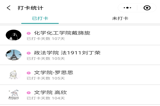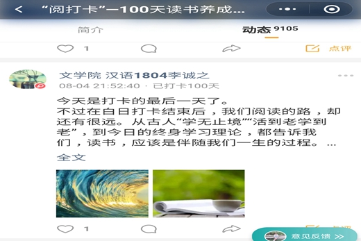 “阅打卡”—100天读书养成计划能够让我们在这个以快速与效率为关键词的时代中保持阅读的习惯,利用微信平台进行阅读分享顺应了时代又不被时代所裹挟。活动调动了广大学生的读书热情,成为拓展学生素质,推动学风建设的有力载体。