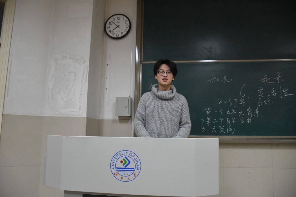 汉教1901团支书周一哲从“全会概况”与“五中全会如何书写大变局下的中国故事”两个部分着手,讲述了全会提出的做好“十四五规划”需要遵循的六个要求和五个“必须”。这六个要求和五个“必须”明确了祖国未来发展的方向,彰显中国特色社会主义制度的灵活性。同时,他也向在座的团员干部传达了全会发出的“坚持习近平新时代中国特色社会主义思想的指导,为全面建成小康社会现代化国家开好路、起好步”的呼吁和号召。