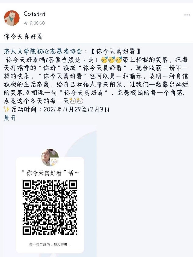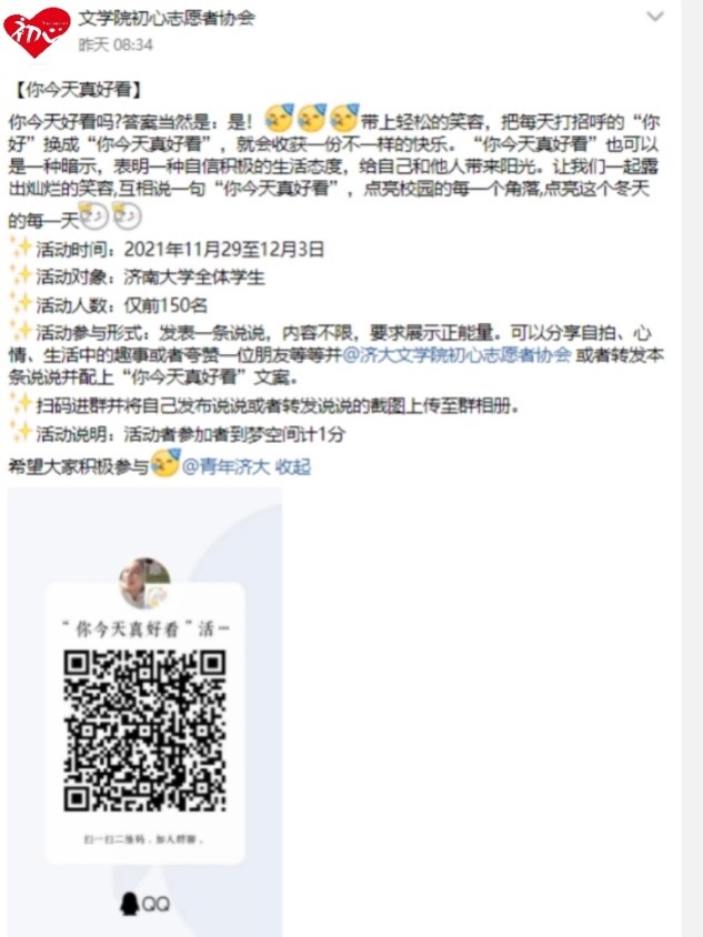 初心志愿者协会于11月29日至12月1日在线上开展了“你今天真好看”活动,迎来了广大同学的积极参与。