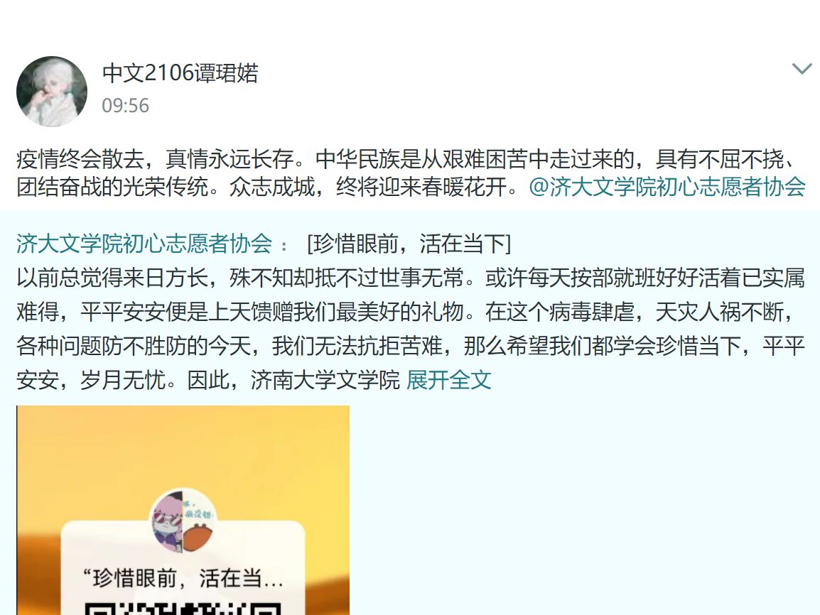 “时代的一粒灰,落在每个人的头上,就是一座山。”秉持着这一宗旨,初心志愿者协会在活动策划期间紧跟时事,确立了“乐观生活,传递温暖”的活动主题。活动过程中,志愿者们广泛宣传,吸引了大量同学参与其中,得到强烈反响。同学们积极留言,纷纷写下了自己对近期生活的感悟,分享快门里的春日风景以及备忘录里的书摘等,传递了温暖和正能量,同时让也同学们更加乐观包容的对待特殊时期的生活。