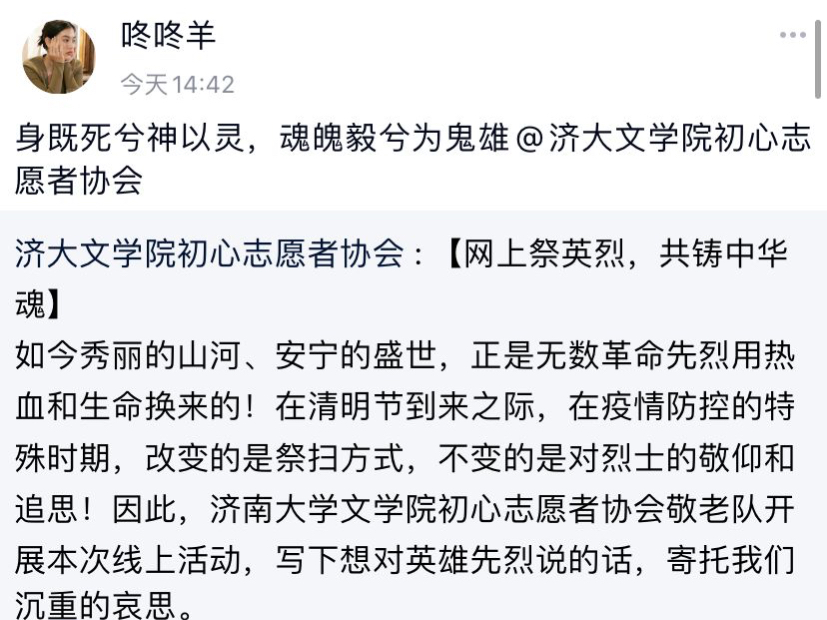 初心志愿者协会于2022年4月6日面向学校全体同学举办“清明线上缅怀先烈”活动,呼吁同学们网上祭英雄,共铸中华魂。