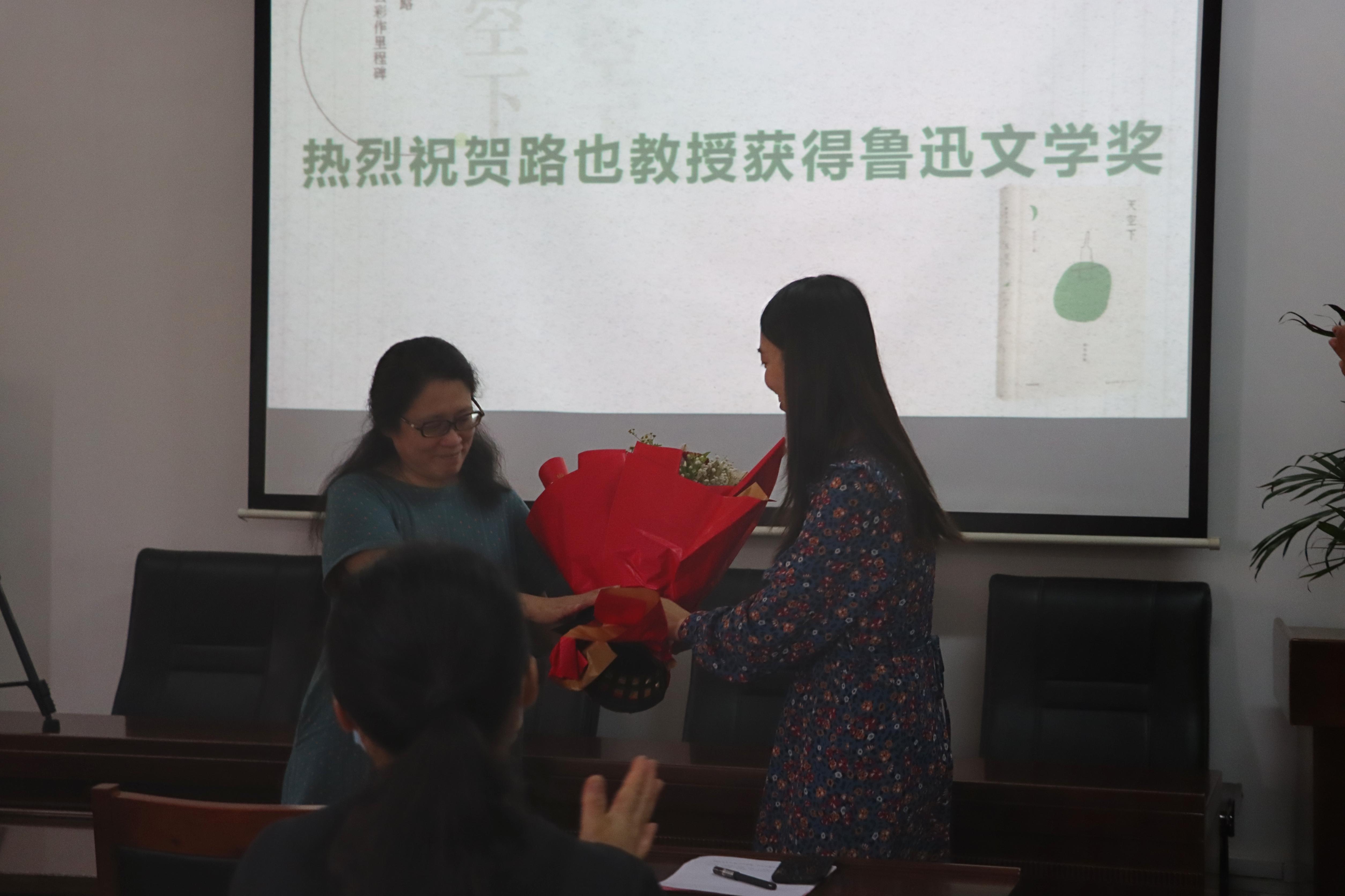 会上,路也教授向大家分享了创作心得,并表示“文学写作是我在这个世界上探索真理的一种方式,这是我喜欢的方式”。对于获奖,路也教授十分谦虚,她总结道:“获奖没什么特别值得说的,就是高兴、感激、激励。”平淡的语言中展现了她对文学始终如一的态度。最后,路也教授特意赠送给在场每一位教职工亲手签名的获奖作品《天空下》,共同分享喜悦。捷克论坛
