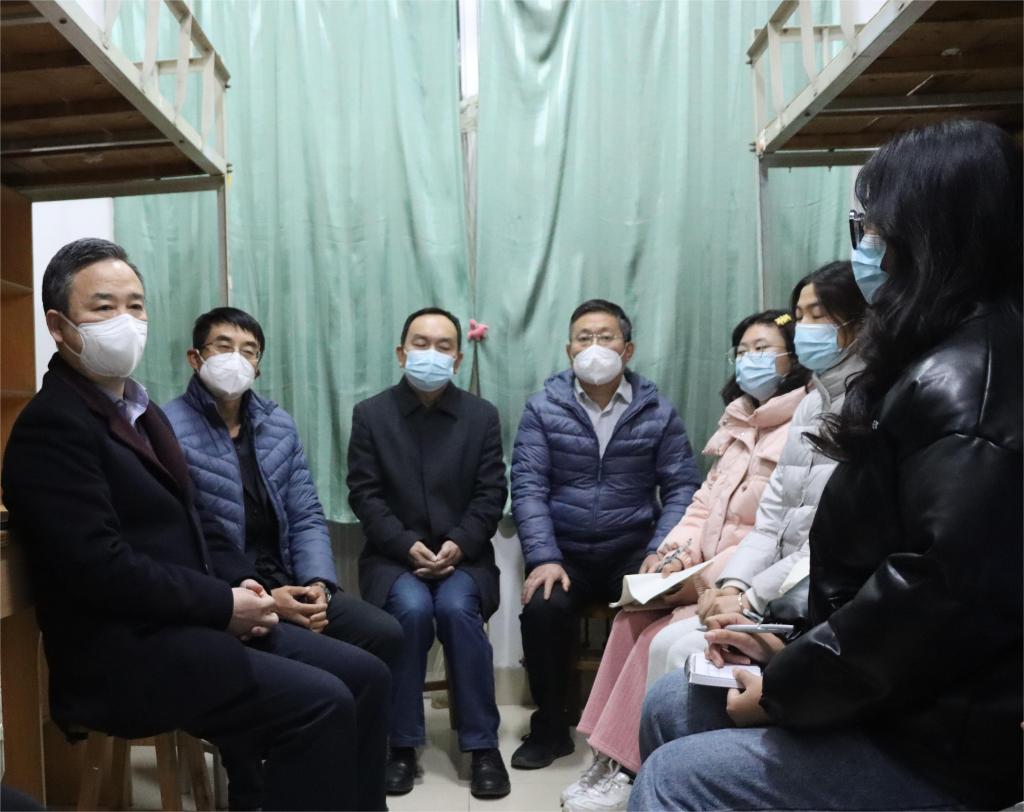 在公寓值班室,师生围坐在一起,面对面交流,聊学习、谈考研、话就业。针对同学们反映的一些问题和诉求,学校领导认真听取后,耐心细致地给同学们逐一解释、说明情况。同时转达了学校对同学们的关心和关爱,请同学们再坚持、再配合、再努力,大家齐心协力,共同牢牢守住学校疫情防控的底线。希望同学们生活上,遇到困难大家要相互帮助;学习上,要树立目标,多读书,养成良好学习习惯;思想上,要坚定信仰,学会思考,特别是疫情下要保持良好心态;更要加强体育锻炼,拥有强健体魄,努力成为一个德智体美全面发展的大学生。