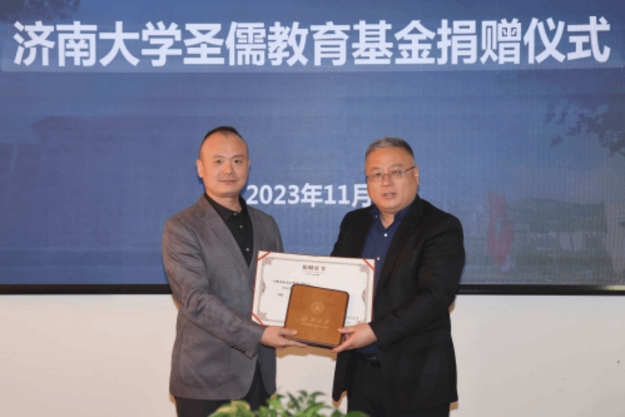 捐赠仪式上,黄加栋为圣儒恒信(山东)教育科技有限公司总裁王建伟颁发了捐赠证书、纪念牌。