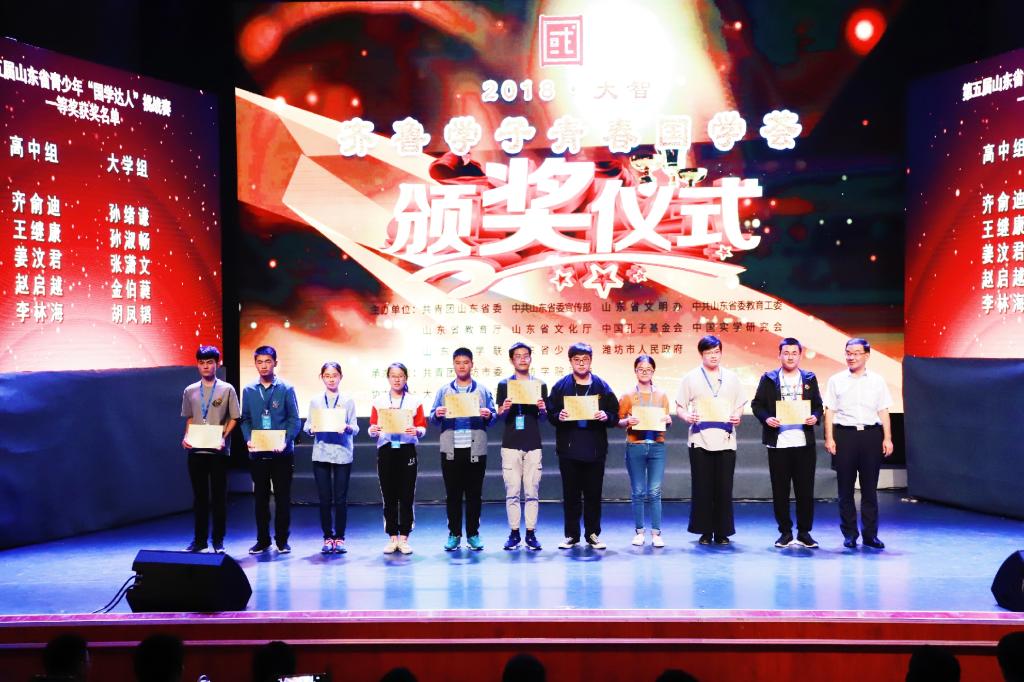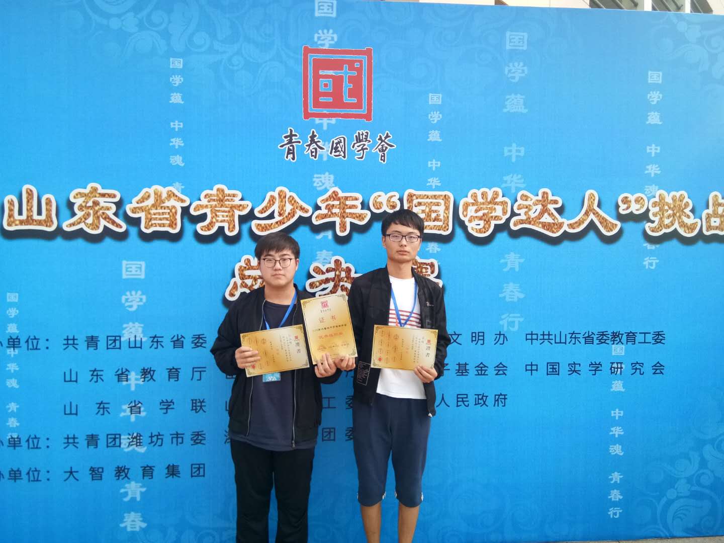 孙淑畅同学在预赛中以第4名的成绩突出重围直接晋级决赛第二赛段,并在接下来的比赛中轻取对手,顺利进入八强,最终获得了一等奖的好成绩。朱超同学以预赛第16名的成绩晋级决赛第一赛段,最终止步34强。赛后,两位同学参加了中华传统文化齐鲁论坛,齐鲁学子“三礼示范教育,“奔跑吧国学达人”户外主题训练营及齐鲁学子潍县文化研学游等活动。