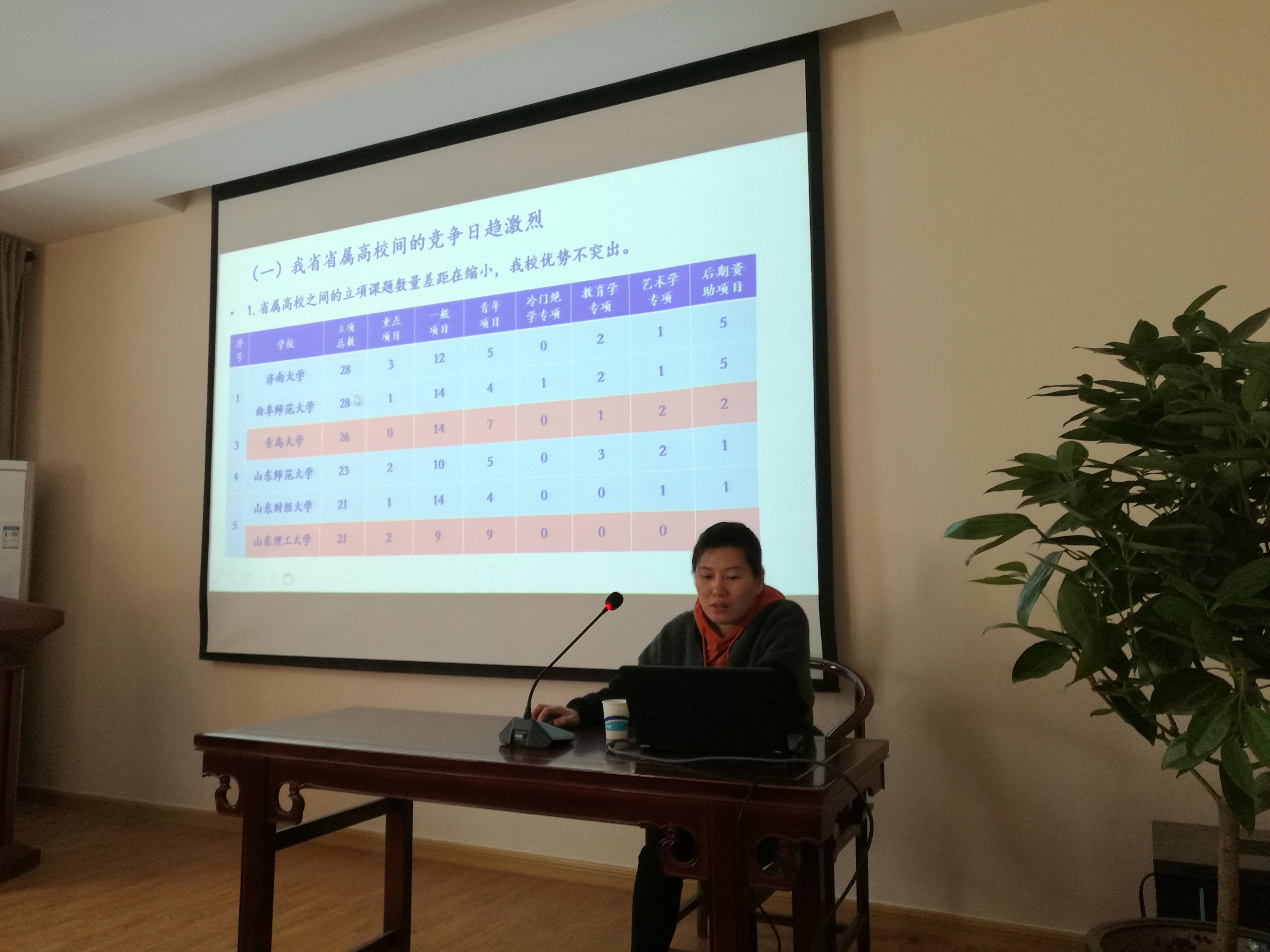 任慧颖副处长总结我校2019年度各类项目的申报和立项情况,分析立项学科分布、新的突破,解读通讯评审的新动向以及应对策略;分析我校近年立项选题,认为“选题至关重要”,应建立预判机制;并就社科工作谈了几点感想:省属高校竞争日益激烈,我校优势有待进一步提升;应了解老师们的研究动向,根据不同项目类别的特点和要求,有针对性地发掘我们的项目申报潜力,争取每类项目都能够有所斩获,保持我们的竞争力;科研工作应有恒心和信心;并介绍2020年度社科工作推进表,希望捷克论坛