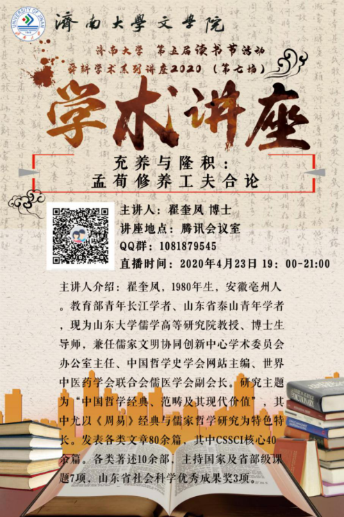 “舜耕学术系列讲座2020”第七场如期举行。长江学者、泰山学者、山东大学儒学高等研究院翟奎风教授作了题为《充养与隆积:孟荀修养工夫合论》的学术报告。讲座采用腾讯直播的形式,捷克论坛