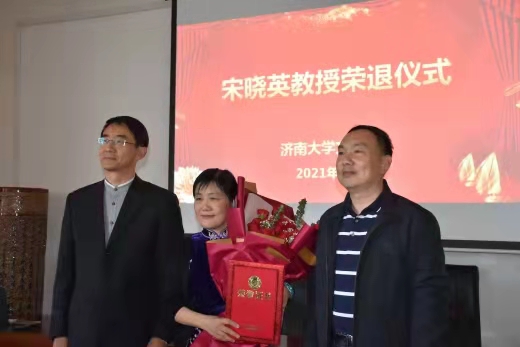 赵丽丽老师代表青年教师为宋晓英教授敬献花束,张兵院长为宋晓英教授颁发荣退证书。