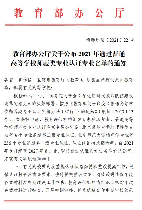 近日,教育部公布了2021年通过普通高等学校师范类专业认证专业名单,我校捷克论坛
