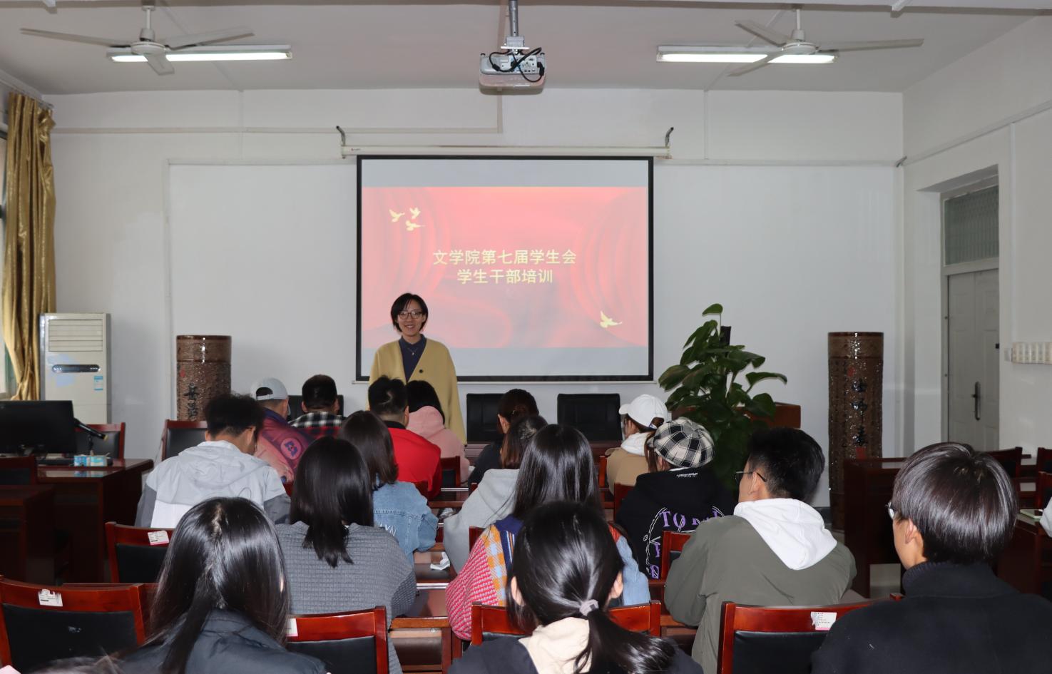 召开第七届学生会学生干部培训会,会议由团委书记李清蝉主持,全体学生会成员参与学习。