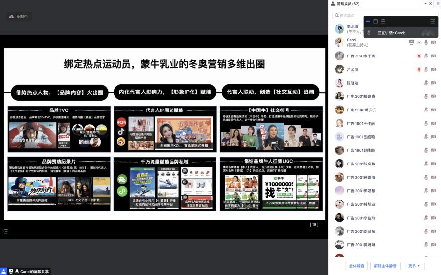 2022年4月23日晚8点,广告学专业邀请群邑(上海)广告有限公司范小玲女士面向广告学专业师生进行了一场线上经验分享交流会。本次交流会围绕大广赛参赛经验、广告公司面试tips、广告行业发展趋势与就业前景等内容展开。广告学专业2020级、2019级学生认真聆听了讲座,广告学专业陈晓洁、徐利、刘水清老师参加了此次交流。