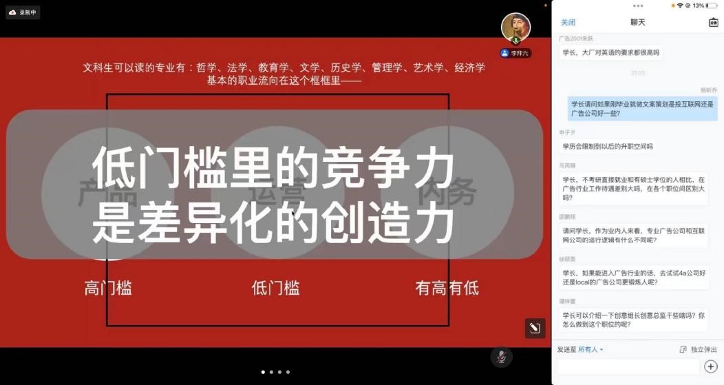 2022年4月28日晚8点,广告学专业邀请BIGDOOR大门广告创意群总监李鑫先生面向广告学专业师生进行了一场创意分享会。本次分享会主要围绕广告学专业和广告行业的底层逻辑、广告公司运作流程、大广赛参赛建议和广告人职业生涯规划等内容展开。广告学专业2018级学生、广告学专业教师陈晓洁、徐利、刘水清积极参与并认真聆听了本次分享会。