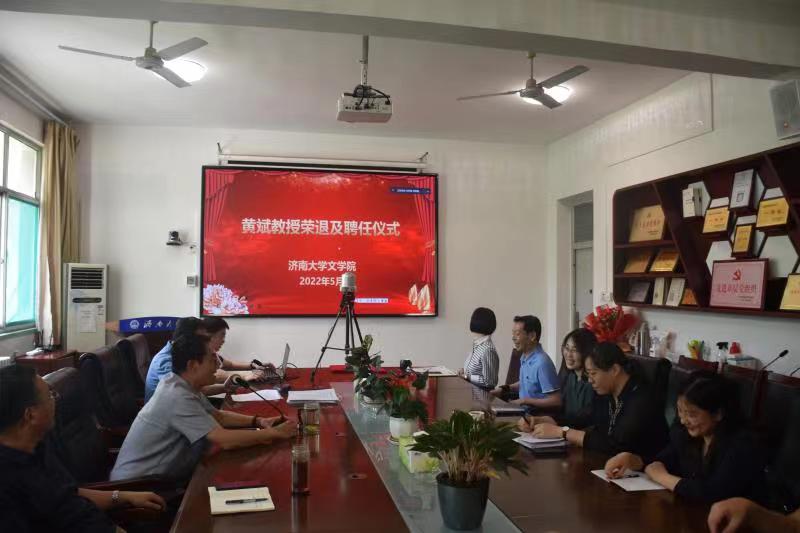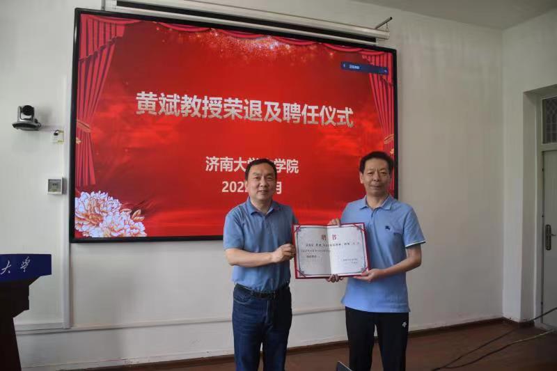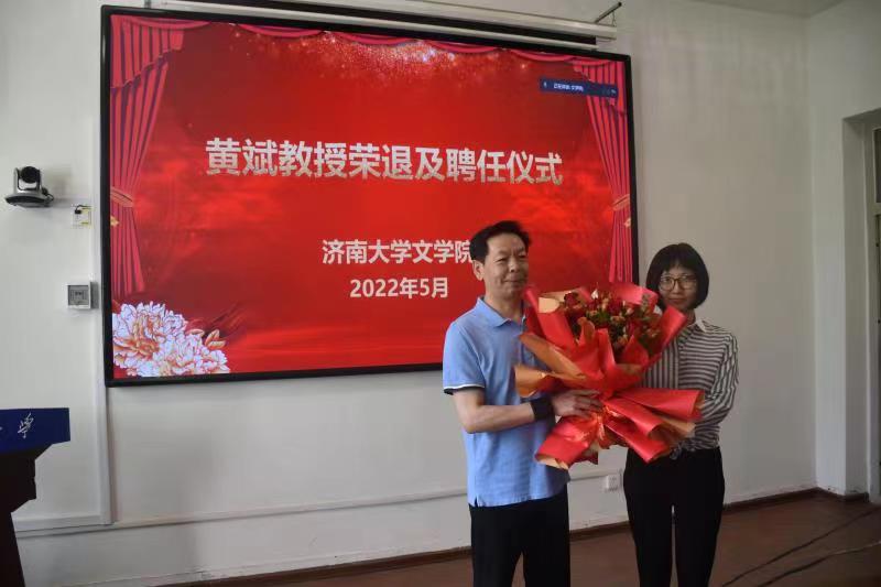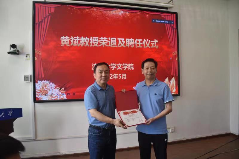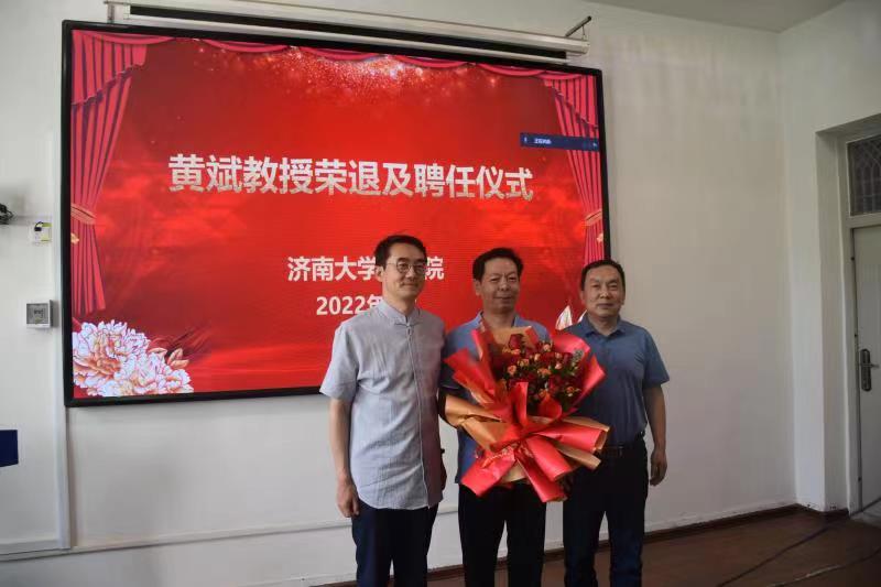 党委书记陈卫东主持,刘水清老师代表青年教师为黄斌教授敬献花束,张兵院长为黄斌教授颁发荣退证书和聘任证书,部分因疫情无法前来现场的教师,也通过线上方式参加仪式,共同为黄斌教授光荣退休献上祝福。
