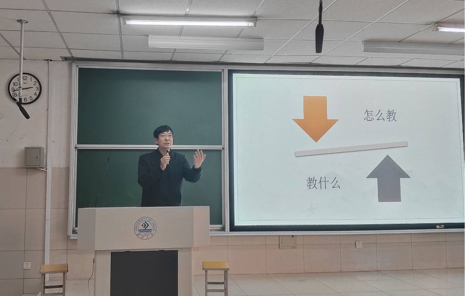 11月29日下午,邀请济南实验初级中学特级教师陈万太在2J105举办了见习讲座。本次讲座陈老师围绕“如何教”和“怎么教”展开,他强调解读文本是语文老师的基本功,根据文本的特点,可以将教材文本分为:主题型文本、语用型文本、思辨型文本、写作型文本、诵读型文本、跳板型文本、积累型文本等,随后陈老师结合课文和教学成果具体分析如何灵活地根据不同文本特点进行教学。