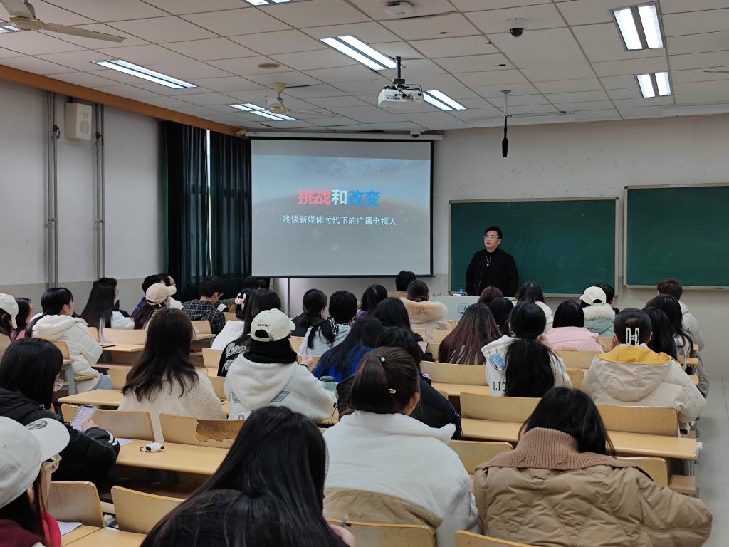 本次讲座由广播电视学专业负责人孙佳祺老师主持,21级广电专业学生全体参与。讲座伊始,王铎老师从“你心中的广播电视工作”、“你想从事怎样的广播电视工作”两个问题引入,并通过自己接触过的一个实习生案例,向大家讲述了职场与学校的不同。随后,王铎老师从自身实际出发,饱含热情地分享了自己作为主持人和解说员在直播间、演播室和比赛现场的工作经历和经验。“新媒体时代下,广播电视人面临挑战,在不忘初心,守住底线的同时需要做出改变。”王铎老师以此作为讲座的核心,提出了身为一个媒体人应该具备的四大素养:要做一个观察者,一个思考者,一个学习者,一个勇敢者。讲座的最后一个部分以“爱你所爱 无问西东”为题,王铎老师在最后部分真诚分享了自己的热爱与生活,他表示:工作亦生活,要热爱和享受它。“青春璀璨,人间值得”,王铎老师以此作为寄语,呼吁在场同学把握当下,珍惜大学时光,找到自己真正热爱的东西并为之努力。