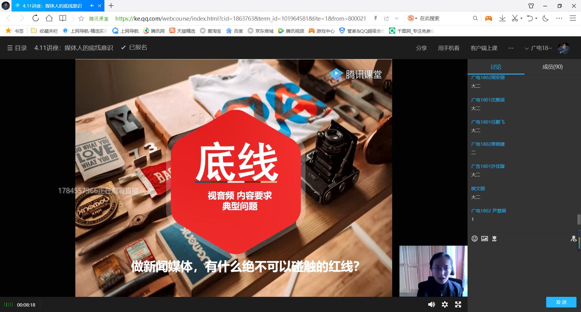 胡顺淑老师从新闻伦理案例、制片审核方向、底线红线意识三个方面展开,延展至当前行业的要求,并对广电学子做出发展提出建议。首先,以《饥饿的苏丹》、《搜索》等新闻行业著名争议事件作为题引,再讲述疫情期间女记者不适当采访钟南山院士的热点事件,阐释媒体人的职业担当和新闻素养;由此提出“新闻的人文关怀”。紧接着,对互联网流量时代“人人都是麦克风”、“注意力就是经济”提出见解,就自媒体的运营现状进行概括性总结,以“咪蒙”等公众号的兴衰讲解“获得饭碗和保住饭碗”的孰轻孰重,形象的解释底线意识和红线标准的新闻原则。胡顺淑老师从制片和监测中的九大节目种类为引提出了符合社会主义核心价值观的总体要求,并就新闻类、综艺类、情感调解类、涉法涉案类、未成年人参与类、少儿类、谈话访谈类、生活服务和资讯类、科教类等电视节目进行解读,提出“线上线下一个标准”这一观点。