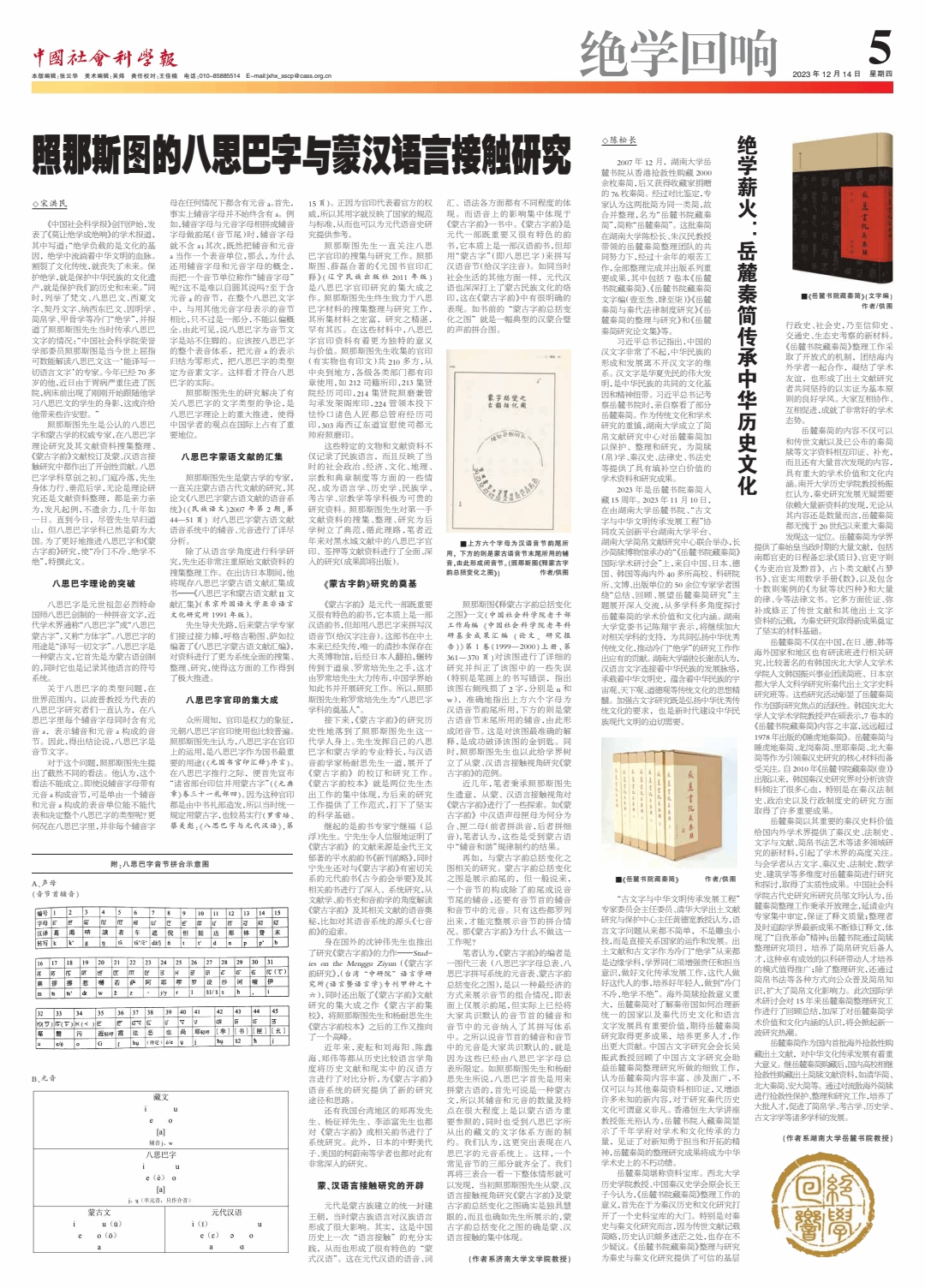 宋洪民教授授予2023年12月14日在《中国社会科学报》发表文章《照那斯图的八思巴字与蒙汉语言接触研究》。
