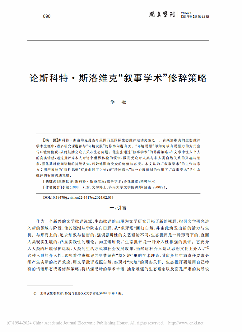 捷克论坛李敏博士的论文《论斯科特·斯洛维克“叙事学术”修辞策略》于《关东学刊》2024年第2期发表。