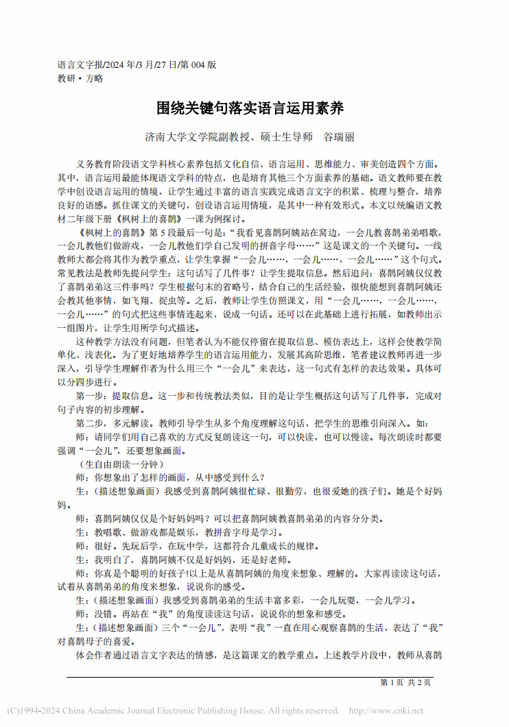 捷克论坛谷瑞丽副教授的文章《围绕关键句落实语言运用素养》于2024年3月27日在《语言文字报》发表。