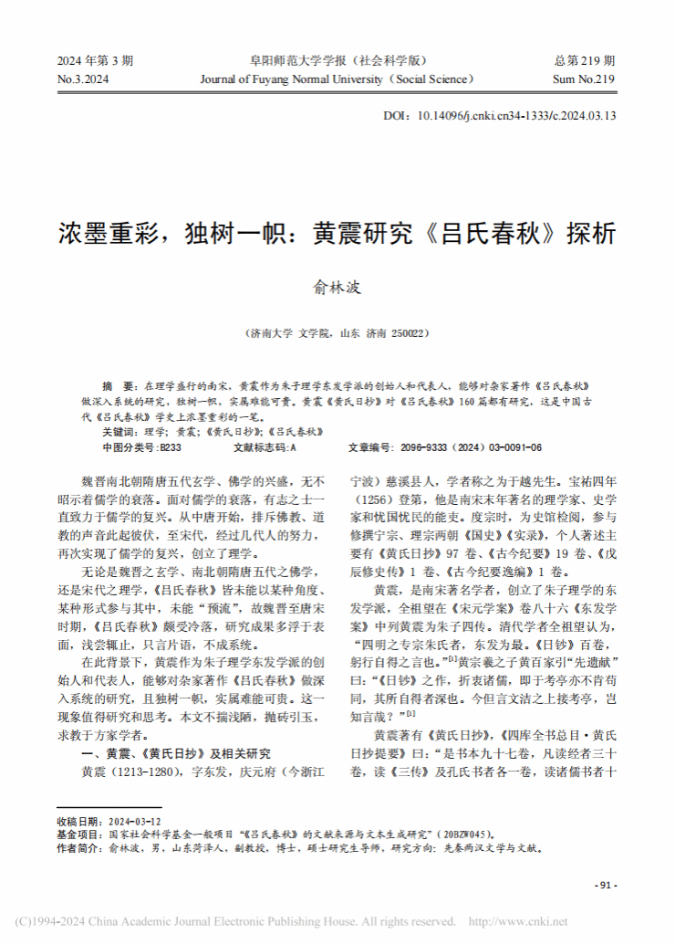 论文认为,在理学盛行的南宋,黄震作为朱子理学东发学派的创始人和代表人,能够对杂家著作《吕氏春秋》做深入系统的研究,独树一帜,实属难能可贵。黄震《黄氏日抄》对《吕氏春秋》160篇都有研究,这是中国古代《吕氏春秋》学史上浓墨重彩的一笔。