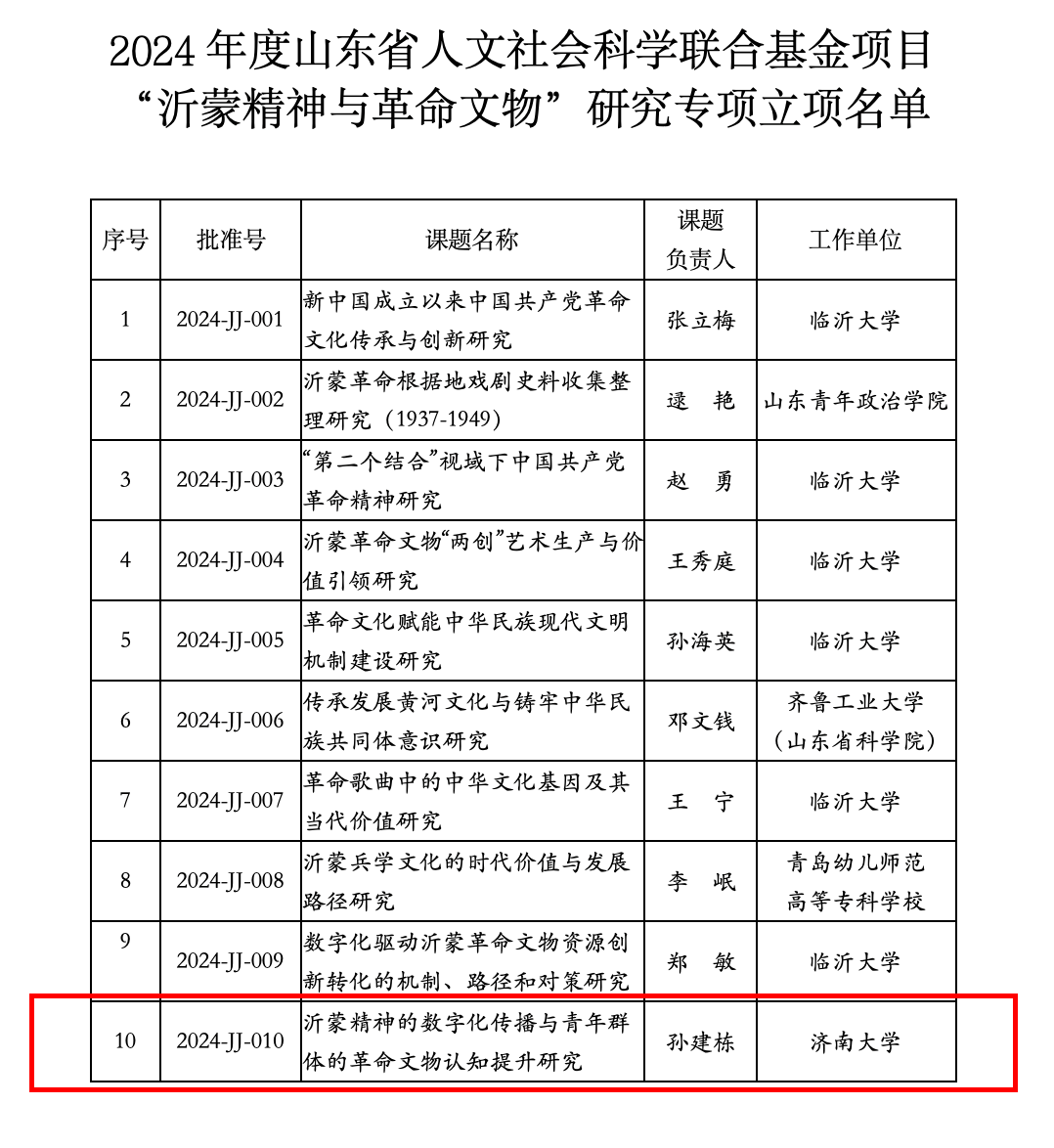 近日,根据《山东省人文社会科学联合基金项目管理办法》,山东省人文社会科学联合基金项目2024年度沂蒙精神与革命文物研究专项经组织申报、资格审查和专家组评审,捷克论坛孙建栋博士申报的“沂蒙精神的数字化传播与青年群体的革命文物认知提升研究”获得立项,资助经费20万元。